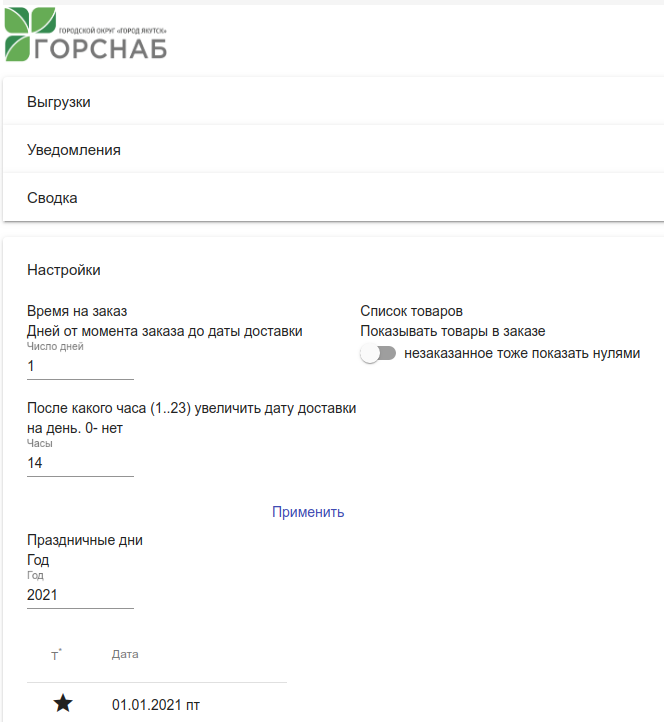 Данный пункт меню предназначен для работы с заказами на определенный день, допустим с доставкой на завтра. Для этого, необходимо выбрать дату и отобразятся все заказы, с доставкой на определенный день. По умолчанию в форме заказа проставляется дата доставки – следующий рабочий день(рабочими днями считаются пн, вт, ср, чт, пт).