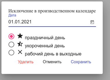 Выберите тип исключения (праздник, укороченный день или рабочий день в выходные).