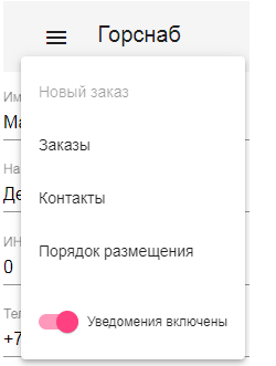 Уведомления информируют Вас о том, что статус исполнения Заказа изменился. Также сотрудник Горснаба может посталть вам короткое уведомление. По умолчанию уведомления отключены.